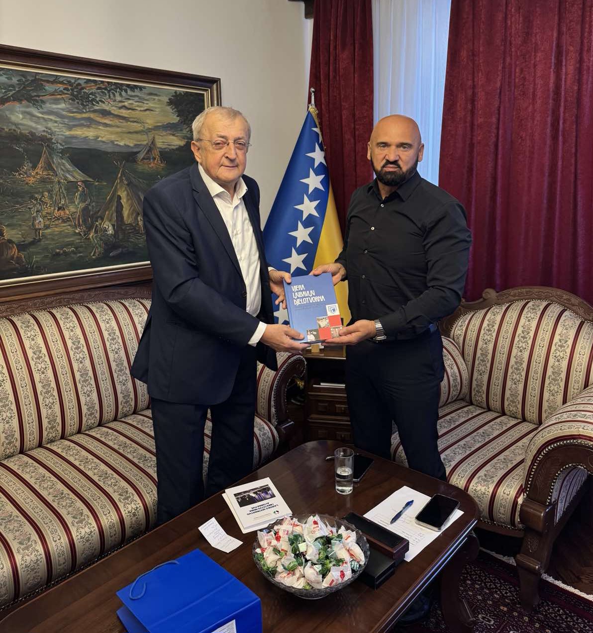 Federalni ministar unutrašnjih poslova Ramo Isak primio je danas u posjetu prof. dr. Franju Topića, autora zbornika „Vjera ljubavlju djelotvorna“.