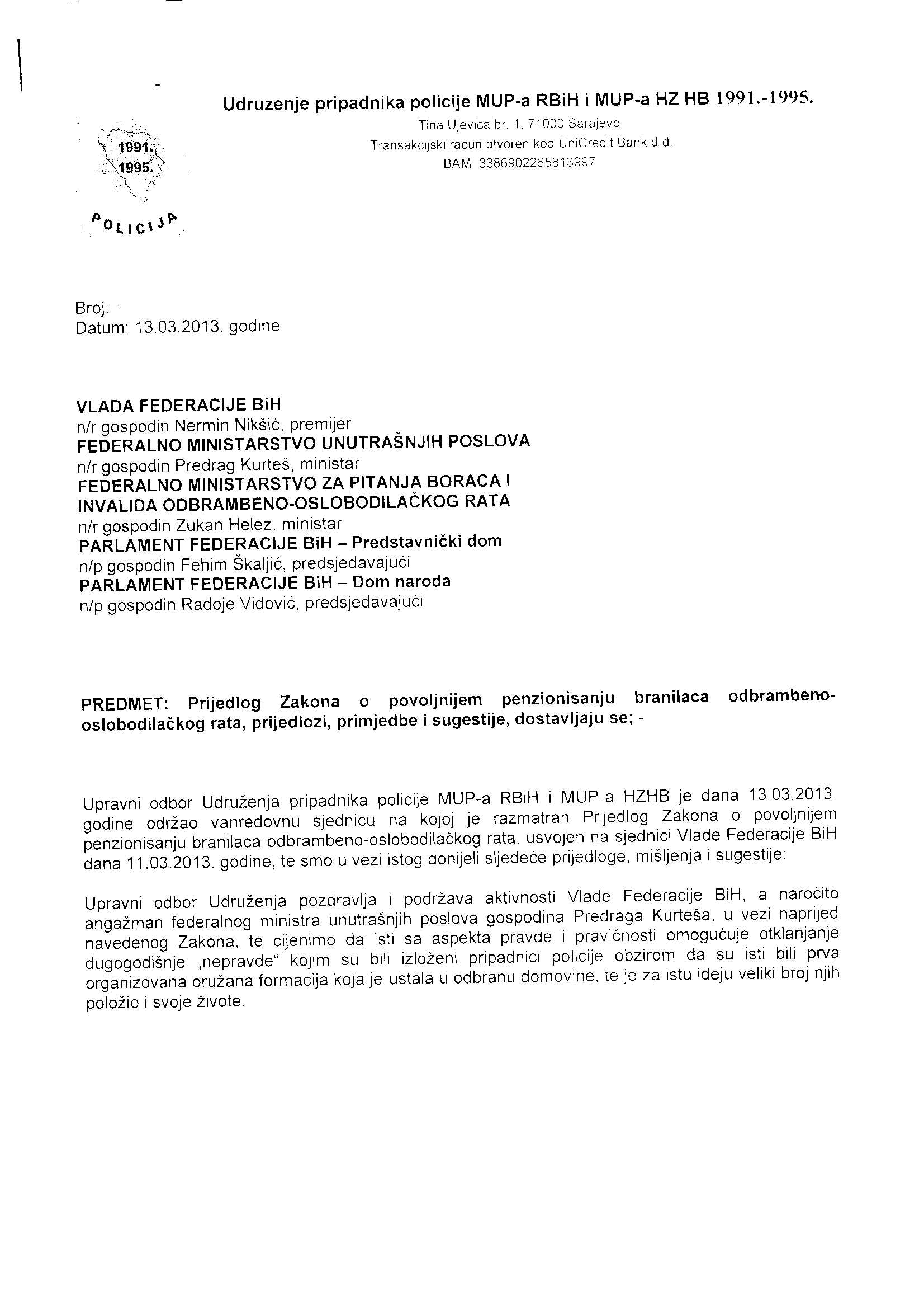 Federalno ministarstvo unutrašnjih poslova smatra da se usvajanjem Zakona o povoljnijem penzionisanju pripadnicima policije omogućava da ostvare ovo pravo na istovjetan način kao i pripadnici Armije RBiH i HVO-a i u kapacitetu koji je adekvatan objektivnim finansijskim mogućnostima Federacije BiH. Koristimo se prilikom da iskreno zahvalimo premijeru Federacije BiH gospodinu Nerminu Nikšiću i ministru za pitanja boraca i invalida odbrambeno-oslobodilačkog rata gospodinu Zukanu Helezu na razumijevanju i punoj podršci, iskazanim u procesu pripreme ovog zakonskog prijedloga.